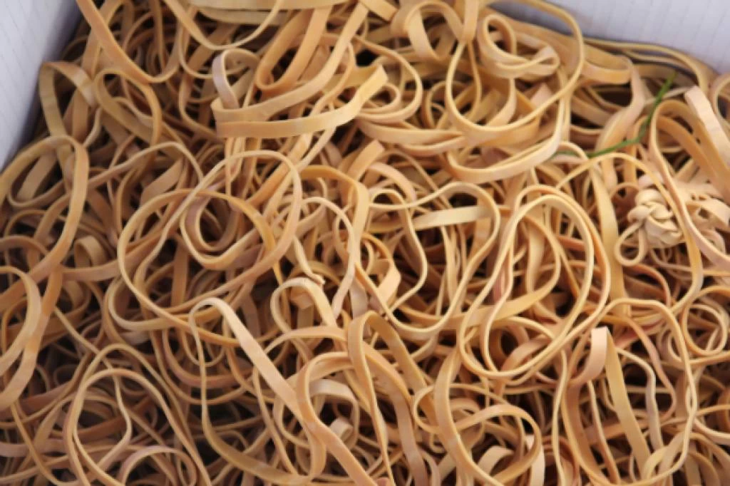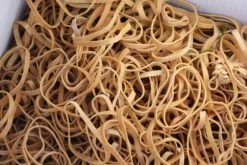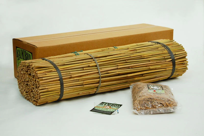 Een doos Bambox met 250 stuks stokken van 90 centimeter lengte 10/12 mm Ø, 1000 gram natuurrubber elastiek, ± 1250 stuks, 50 mm Ø en Bambox instructieboekje.