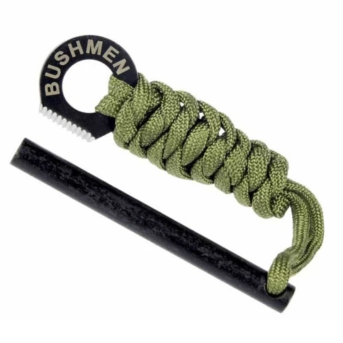 De Bushmen Rebel Firesteel vuurstarter kan worden gebruikt zonder het paracord los te vlechten. De vonker of vuurstarter is van metaal met kartelrand en ideaal voor het creëren van sterke vonken van de vuursteen.