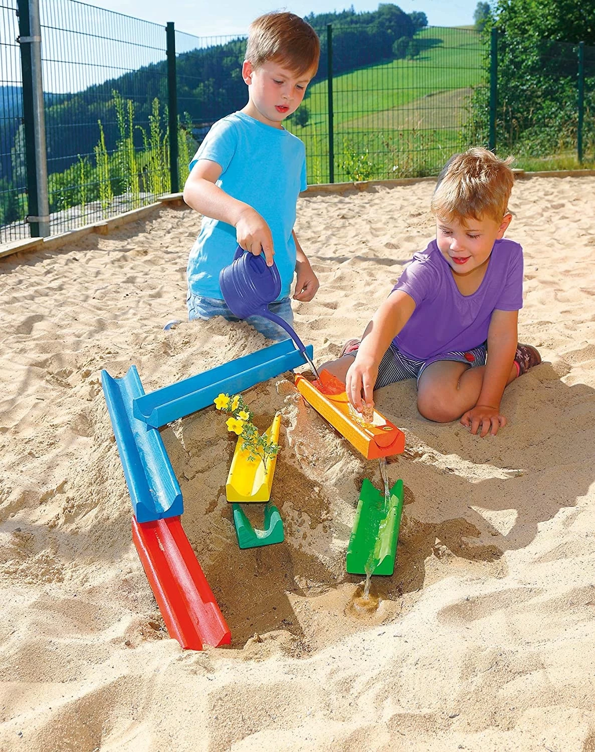 “Het pad is het doel” – zo leren kinderen spelenderwijs hoe de fantasierijke en uitdagende constructie van dit spel de moeite waard is. Stromend water of rollende knikkers effenen de weg van boven naar beneden. Of het nu winter of zomer is, in de kamer of in de zandbak – deze veelzijdige knikkerbaan of waterbaan speelgoed of beiden tegelijk kun je heerlijk samenspelen, maar alleen kan natuurlijk ook. Met de onderdelen en de aanwezigheid van zand kun je een parcours maken zodat knikkers en water er vanaf kunnen stromen of rollen.