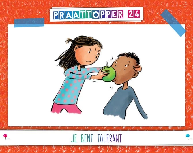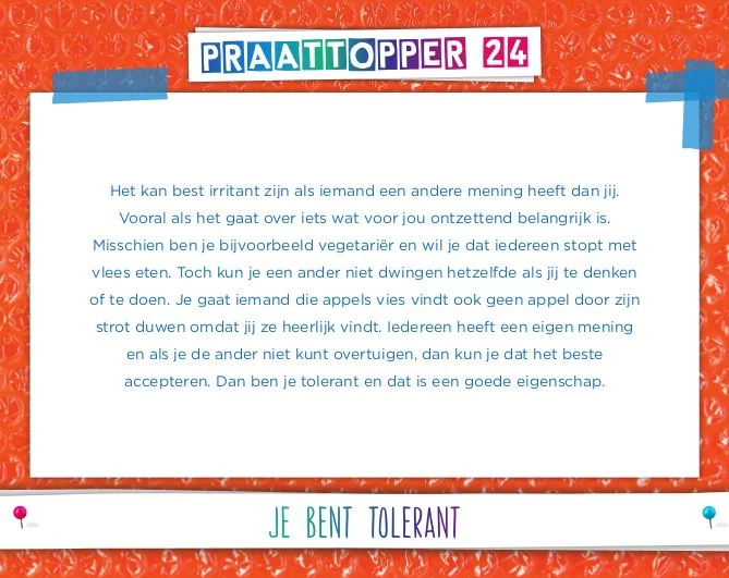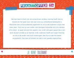 Een Praattopper is een coachkaart met daarop een gewenste gespreksvaardigheid. Op de voorkant staat een grappige cartoon die met een knipoog het belang van deze praattopper laat zien. Op de achterkant staat in voor kinderen begrijpelijke taal een uitleg over deze gespreksvaardigheid. Bij elk van de 30 Praattoppers wordt in de activiteitenwijzer een activiteit beschreven om de vaardigheid te oefenen of illustreren. Zo werk je met deze set coachkaarten spelenderwijs aan de gespreksvaardigheden.