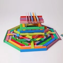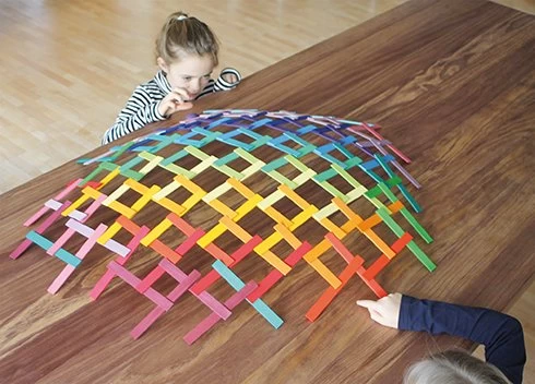 Meer uitleg over dit constructiespeelgoed vind je in de bouwbeschrijving, maar met simpele latjes kun je een brug of een koepel bouwen die zelfdragend is, zonder lijm, touw, spijkers, of andere verbindingsmaterialen. Het constructiemateriaal van Grimms vergt natuurlijk wel wat geduld om uit te vinden en laat af en toe je brein flink kraken, maar deze lindehouten latjes zijn een lust voor het oog als het bouwwerk klaar is en hebben je dan zeker geholpen om je technisch inzicht en motorische vaardigheden te stimuleren