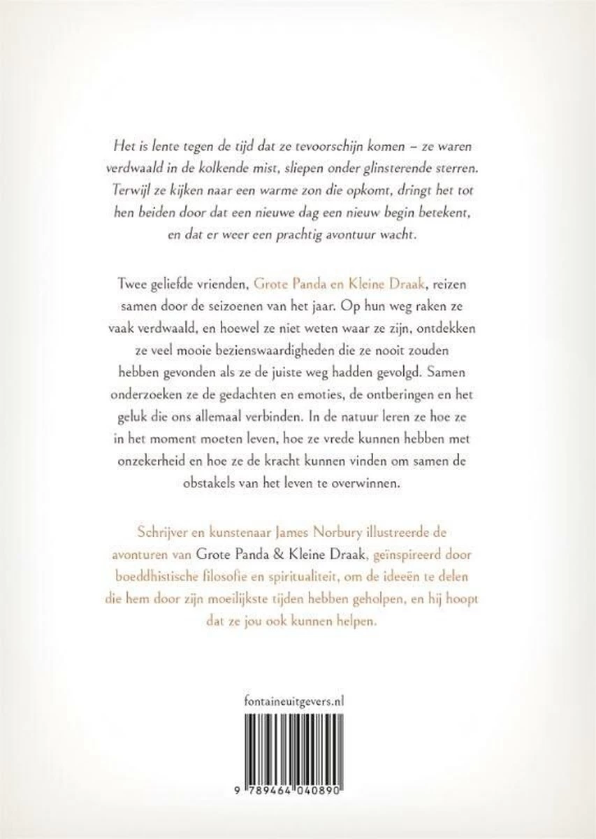 Grote panda en kleine draak onderzoeken samen de gedachten en emoties, ontberingen en geluk welke ons allemaal verbinden. In de natuur leren ze hoe ze in het moment moeten leven, hoe ze vrede kunnen hebben ondanks onzekerheid en hoe ze de kracht kunnen vinden om samen de obstakels van het leven te overwinnen. Zeker nu in deze onzekere tijden een prachtig boek!