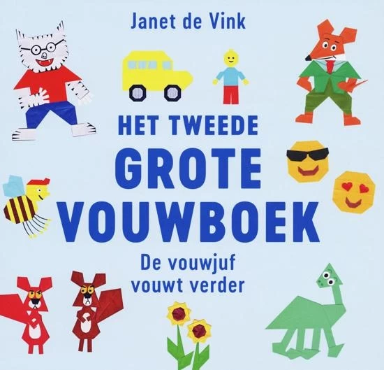 Janet de Vink vouwt verder in Het tweede grote vouwboek! Een fijn boek met 75 originele vouwvoorbeelden voor de middenbouw leerling. Zij maakte bekende prentenboekfiguren, zoals Rupsje Nooitgenoeg en Kikker. Net als in Het grote vouwboek (gericht op de onderbouw leerling) staan er in dit knutselboek weer tientallen vouwvoorbeelden waaraan kinderen veel plezier zullen beleven. Janet de Vink, inmiddels bekend als de vouwjuf gaat uit van de basisvouwsels van de doorgaande lijn van Fröbel. De omschrijvingen zijn duidelijk, praktisch en eenvoudig te volgen. Het enige wat je nodig hebt bij dit doeboek, zijn vouwblaadjes! Het boek staat vol leuke vouwprojecten bij de feesten van het jaar, beroepen, sprookjes en natuurlijk veel herkenbare kinderboekfiguren.