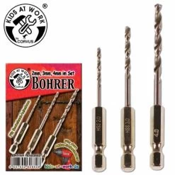 Veel kinderen vinden het fijn om te boren. Gaatjes maken, aan elkaar verbinden van stukken hout of iets aan de muur schroeven. De accu schroefboormachine van Corvus-Toys is nu veelzijdiger te gebruiken met deze boortjes ter aanvulling. Let wel op dat het vermogen van de boor niet toereikend is om lang diepe gaten te kunnen boren. Het is puur een supplementaire mogelijkheid voor kleine knutselwerken.