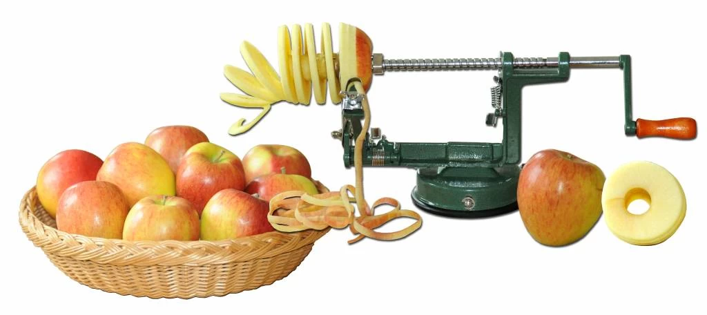 De appelschiller maakt perfecte schijven op de appelpannenkoek en appels schillen voor de appeltaart is veel eenvoudiger.