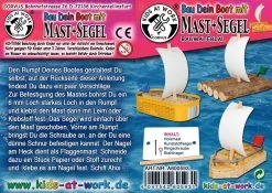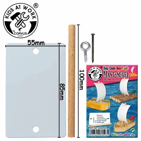 Met een mast en een zeil, inclusief ringschroef en een spijker kun je je eigen ontworpen bootje maken. Misschien maak je er eentje van een colablikje, of van gespaarde kurken uit de wijnfles. Of maak je van takjes of een oud stuk hout, of misschien een blikje sardientjes een supergaaf schip.