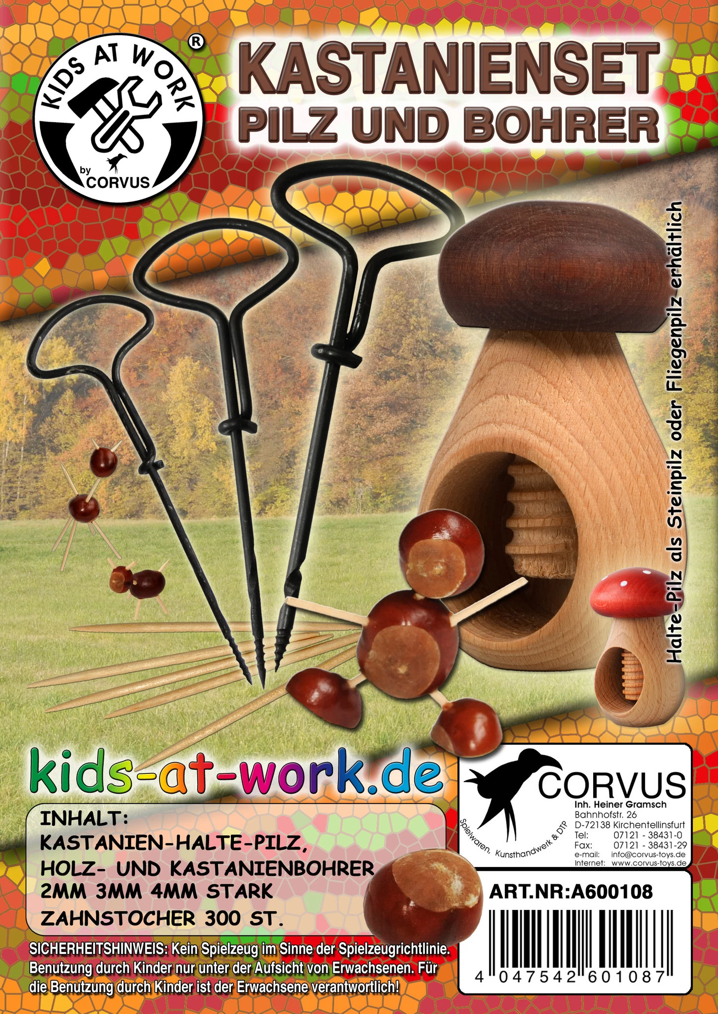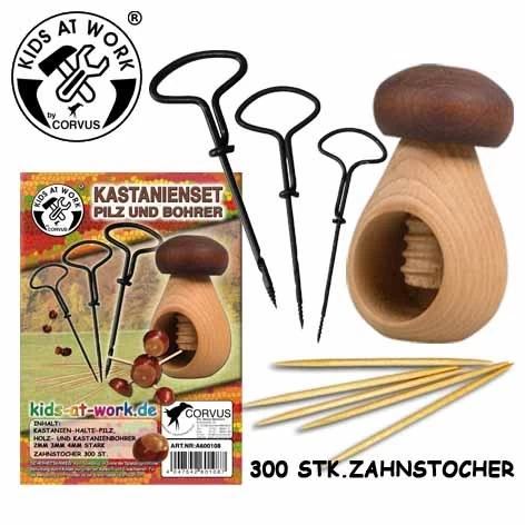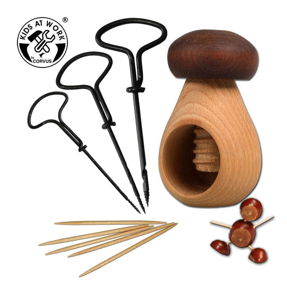 Inclusief bij deze set zijn 300 houten prikkertjes, 3 boortjes in drie maten en een prachtige ergonomische houten notenkraker/kastanjehouder
