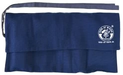 Het formaat van dit blauwe stoffen etui is 35x38cm wanneer open, 20×38 wanneer gesloten en heeft 5 opbergvakken, een klittenbandsluiting en bevestigingsband