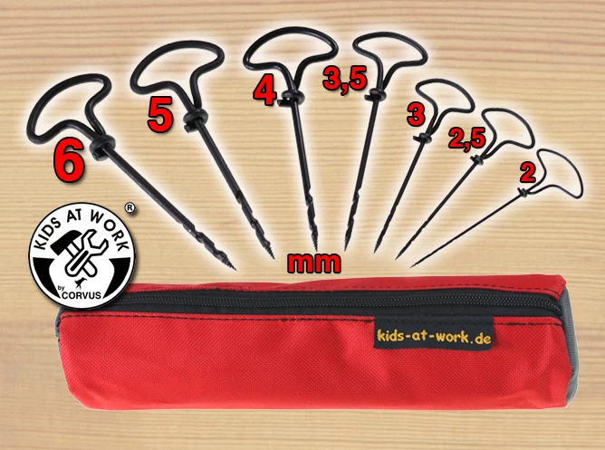 De boren hebben de volgende 7 matenn: 2, 2.5, 3, 3.5, 4, 5 en 6 mm en kun je gebruiken voor diverse boorklusjes. Het kindergereedschap merk Kids at Work van het Duitse Corvus Toys vind je sinds 2009 bij OpzijnPlek. Echt gereedschap past bij duurzaam opgroeien.