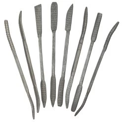 Stoer gereedschap van acht dubbele stalen raspen in een mooie etui om hout of (spek)steen te bewerken. Word een beeldhouwer of leer de kunst van het beeldhouwen.
