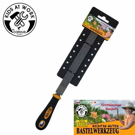 Kids at Work is een stoer merk kindergereedschap. Inmiddels hebben we al heel veel ergonomisch gereedschap voor de kinderhand in ons assortiment en omdat we natuurlijk ook speksteen sets verkopen is daarbij deze rasp een prima alternatief voor de professionele Talcus raspen. Met deze vlakke rasp kun je ook prima houtwerkstukken bewerken. Onze filosofie is dat als een kind werkt met echt gereedschap dat ook de motivatie om een werkstukje af te maken groter wordt, omdat het gereedschap ook echt werkt. Plastic gereedschap en nagemaakt gereedschap bereikt niet de graad van interesse die gewoon realistisch kindergereedschap met ergonomische grepen en gemaakt voor de kinderhand doet.