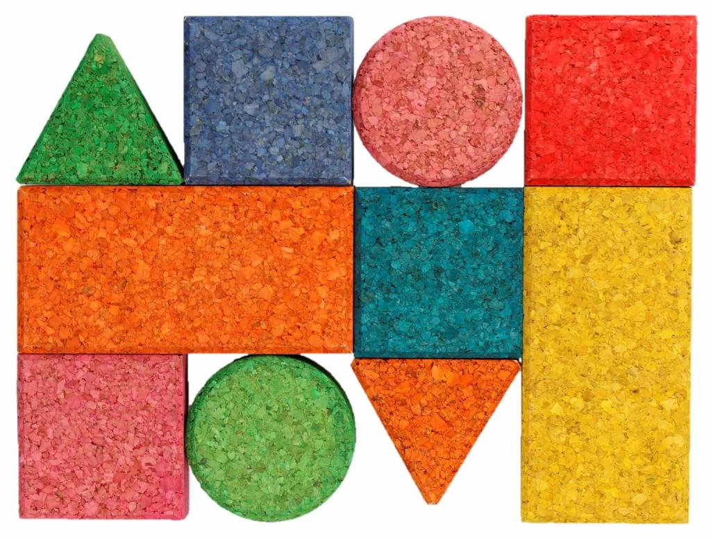 De tien gekleurde blokken zijn gepolijst en hebben daardoor afgeschuinde randen. KORXX adviseert gebruik van haar kurkspeelgoed voor kinderen vanaf 1 jaar oud!