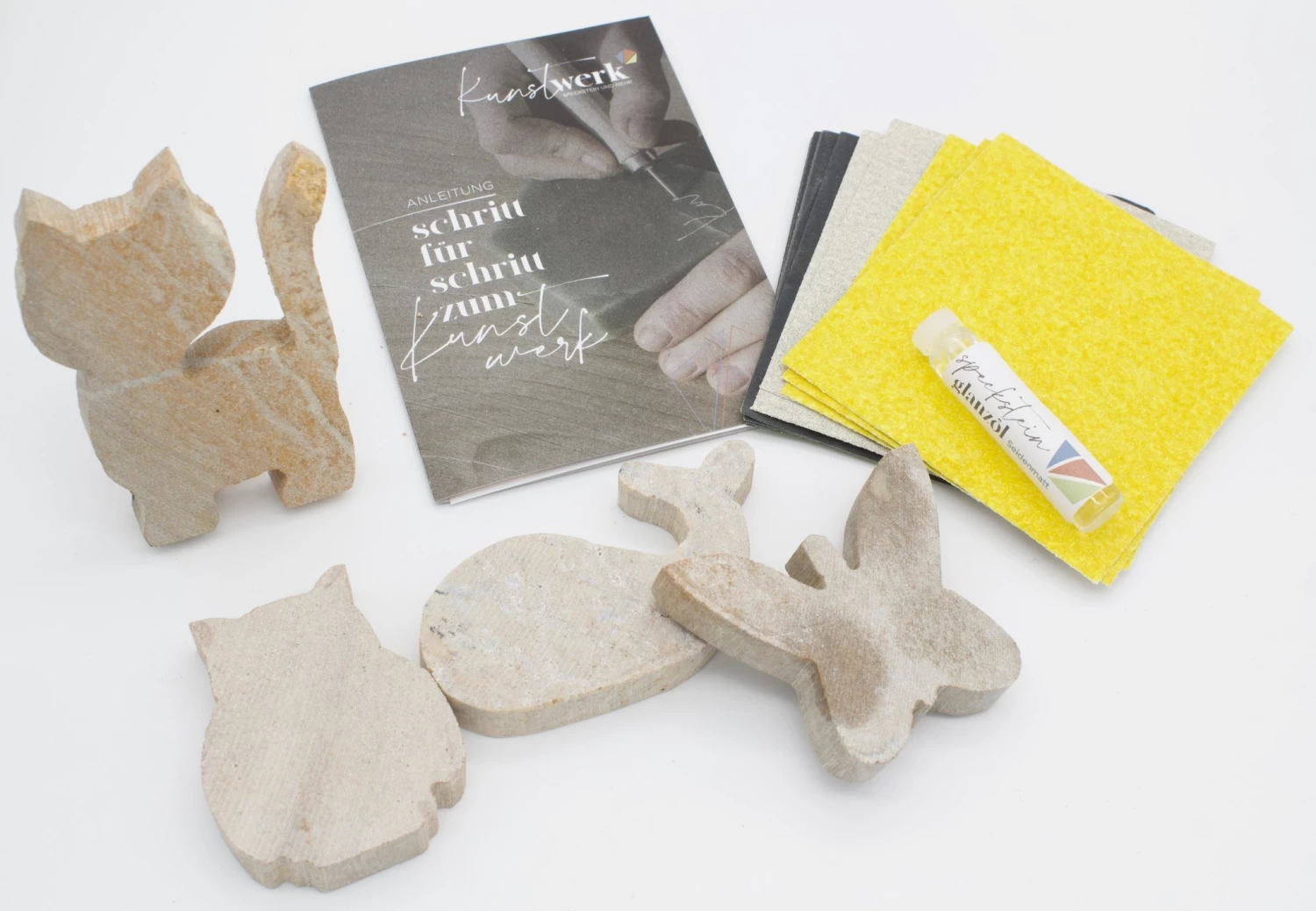 Formen-Set 4 stuks 4 blanco’s van ca. 5x3cm in kleur gemengd,4 sets schuurpapier korrel: 60/120/360, glansolie, instructies