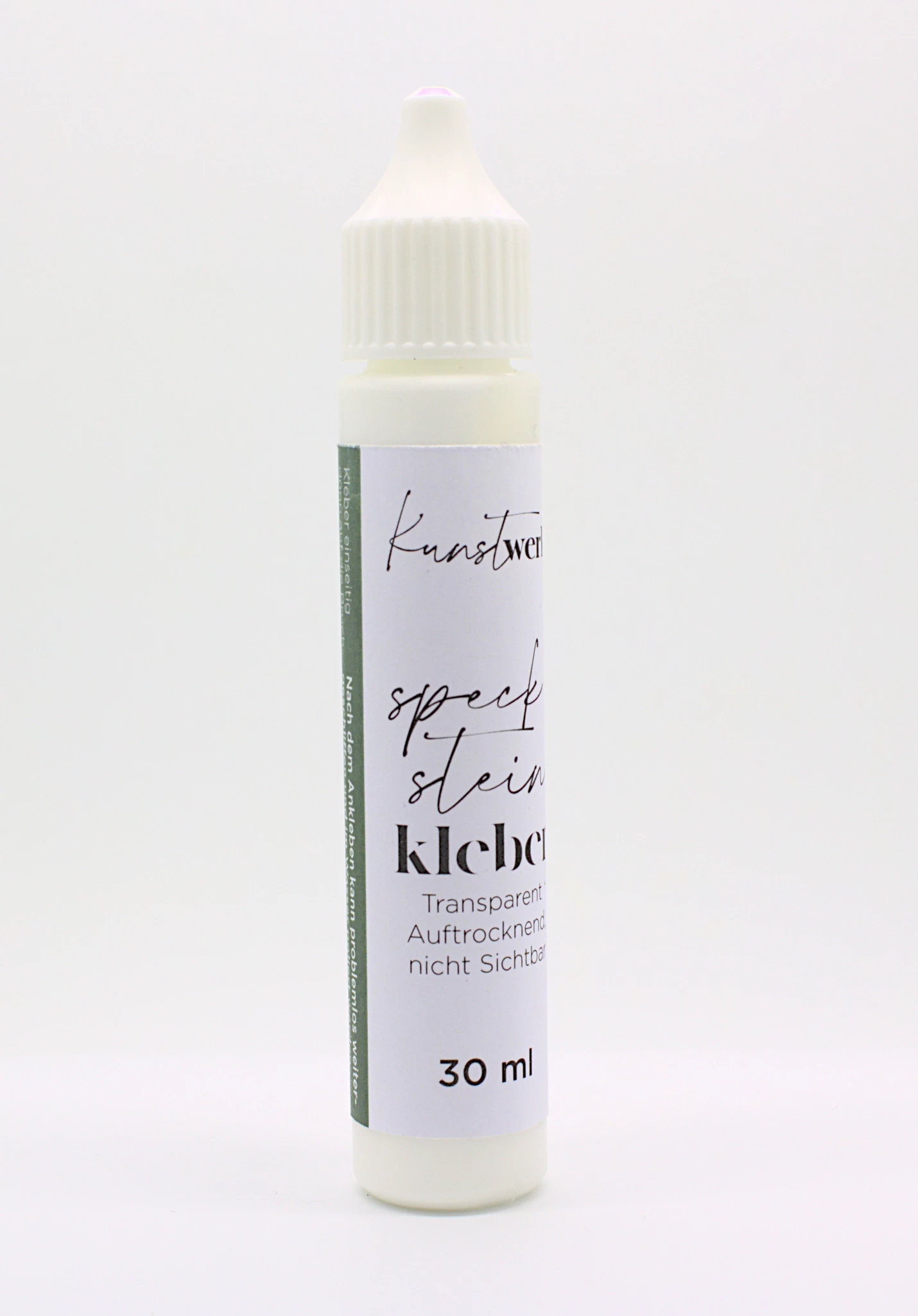 Met speksteenlijm kun je eventuele oneffenheden of stukjes afgebroken speksteen weer hechten, zodat je werkstuk er weer gaaf uit komt te zien. Als je dan daarna weer schuurt, zie je er niets meer van.