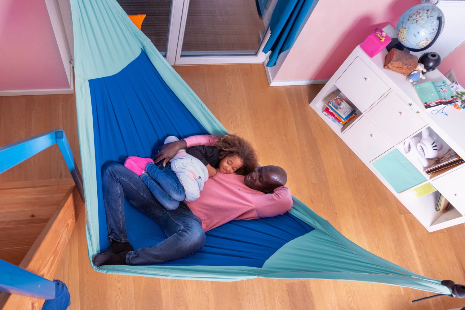 Samen schommelen, rusten of kletsen in een een veilige hangmat voor kinderen.