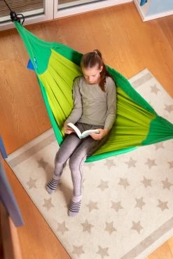 De kinderhangmat Froggy is gemaakt van 2 kleuren groen biologisch GOTS Katoen en is geschikt voor een kind tot de leeftijd van ca. 12 jaar. De hangmat is uitgerust met een gepatenteerd veilig ophangsysteem. Geen kans om tussen gevaarlijke touwen te raken of vingers die ergens tussen kunnen komen.