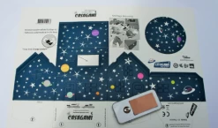 Het Litogami huisje sterren heeft een supermooie en feestelijke opdruk heelal als extra toevoeging. Die licht mmoi op in het donker. Een voorgesneden kartonnen stans om in elkaar te zetten(zonder lijm) in een formaat van 330x 215 mm Een gepatenteerde zelfklevende LED-module op zonne-energie. Dit omvat een mini fotovoltaïsch paneel, een oranje LED-Lichtje, een schakelaar en een oplaadbare Li-Ion-batterij.