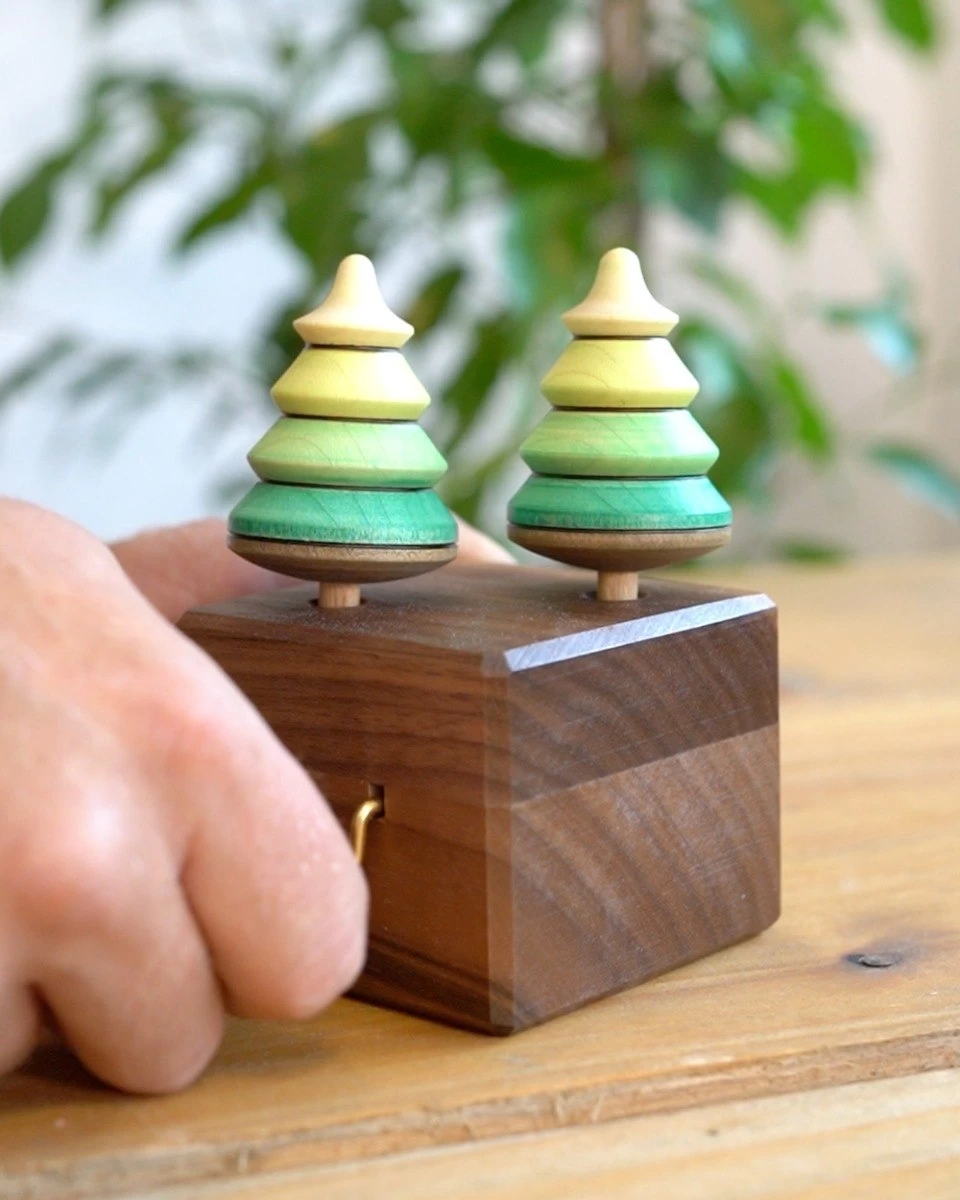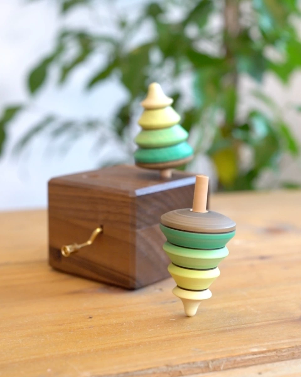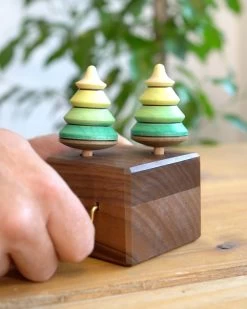Deze prachtige handgemaakte muziekdoos van Mader, gemaakt van walnotenhout, zal een erfstuk en een feestelijke decoratie zijn voor de komende generaties.Het is ook uniek, omdat er twee tollen van bomen op het doosje zitten, die afzonderlijk kunnen worden gebruikt om mee te tollen. Zo wordt dit muziekdoosje ook echt speelgoed voor later en een fantastische herinnering. Wij vinden dit een uniek kraamcadeau!