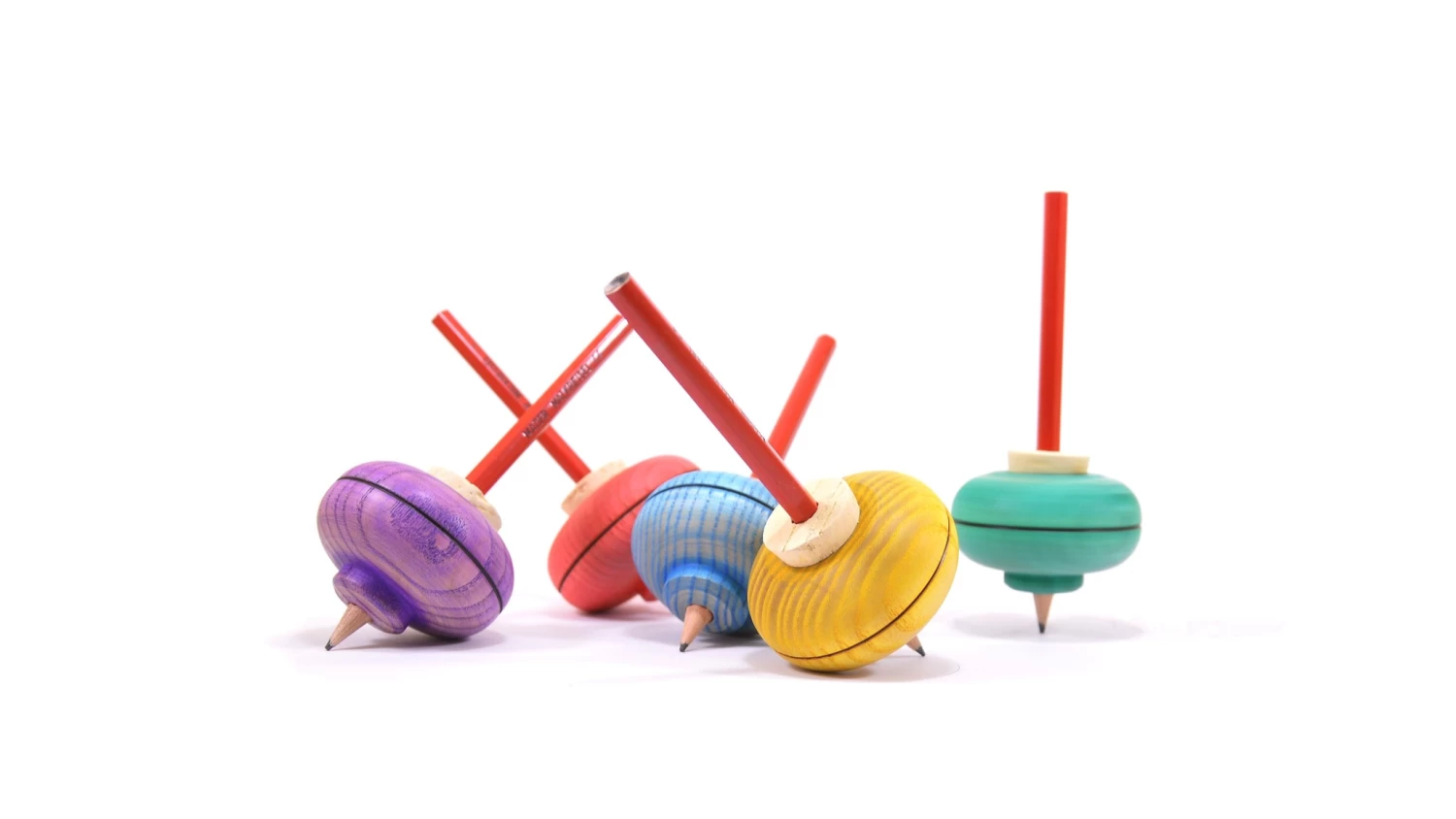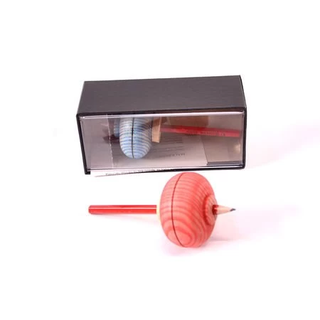 Deze houten tol heeft een potlood als middelpunt waardoor je bij het draaien een tekening krijgt op het papier.