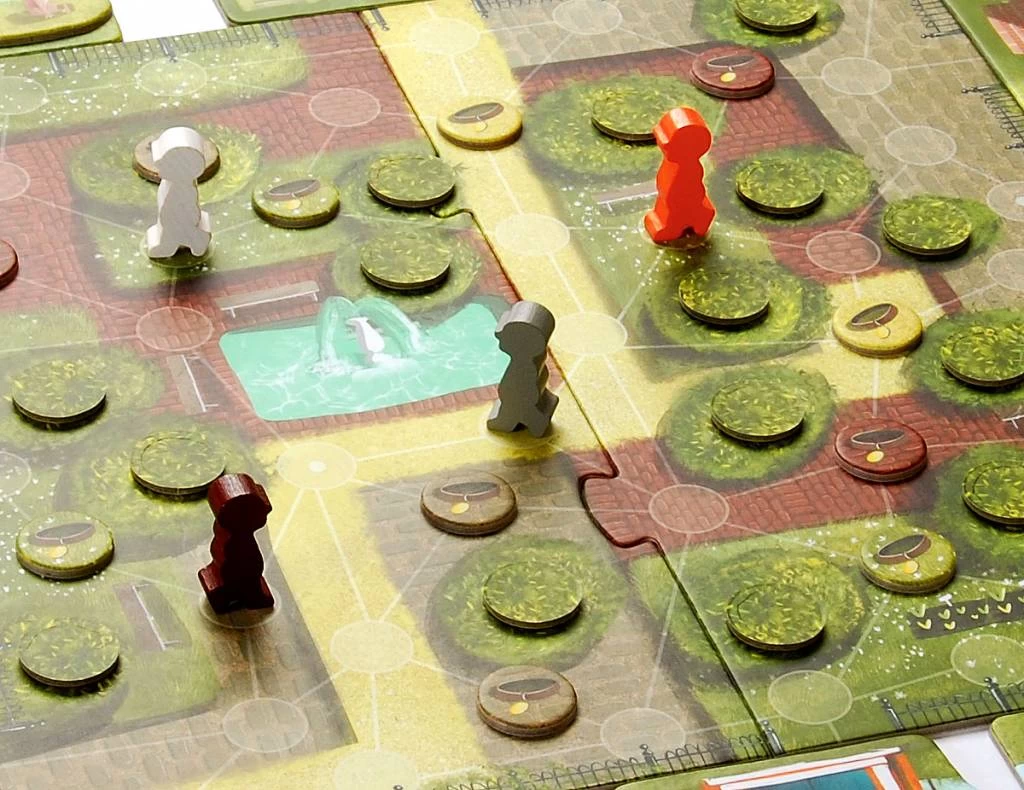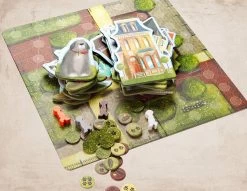 Een spelbord 60×60 cm en speelfiguren (3 cm), 4 kleine detectieven, 12 huizen, 12 honden, een park, 12 fishes, 16 oplossings fishes en een canvas zakje.