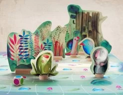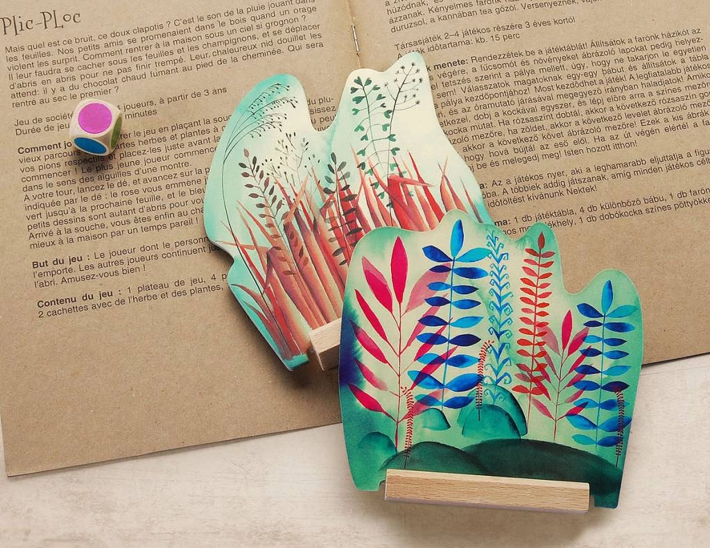 Inhoud: 1 spelbord, 4 verschillende pionnen, 1 boomstamhuisje, 2 schuilplaatsen met gras en bloem, 1 dobbelsteen met gekleurde stippen.