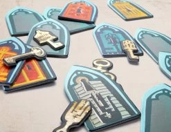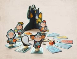Inhoud van het spel: 1 kasteel, 4 ridders, 1 spook, 6 deuren, 6 niskaarten, 7 gouden sleutels, 1 zwarte dobbelsteen en een oranje dobbelsteen