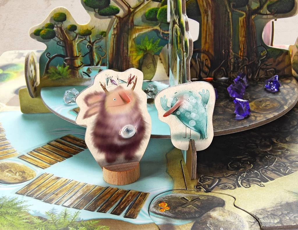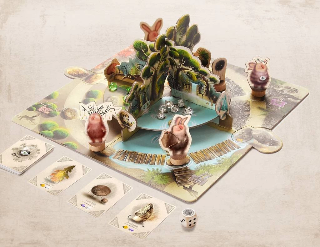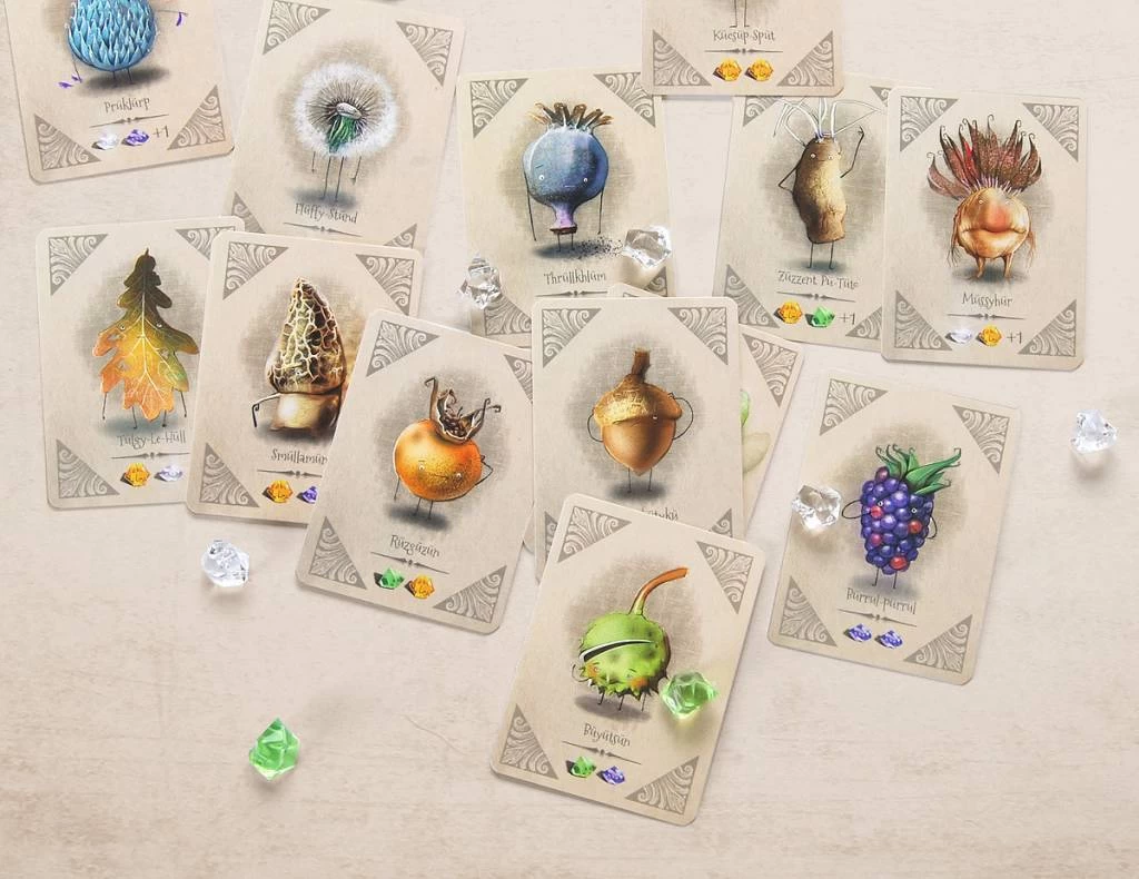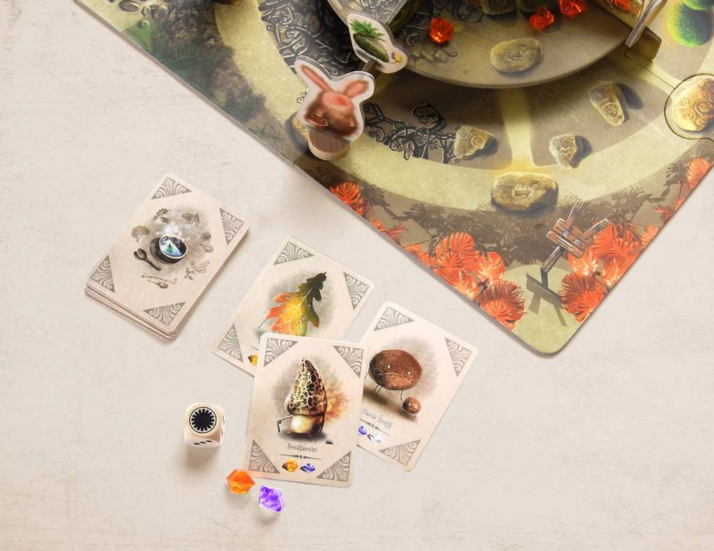 1 bordspel met draaiend bos, 4 Güs, 1 Morc, 4 bosfiguren, 14 receptenkaarten, 1 dobbelsteen, 4×6 kristallen