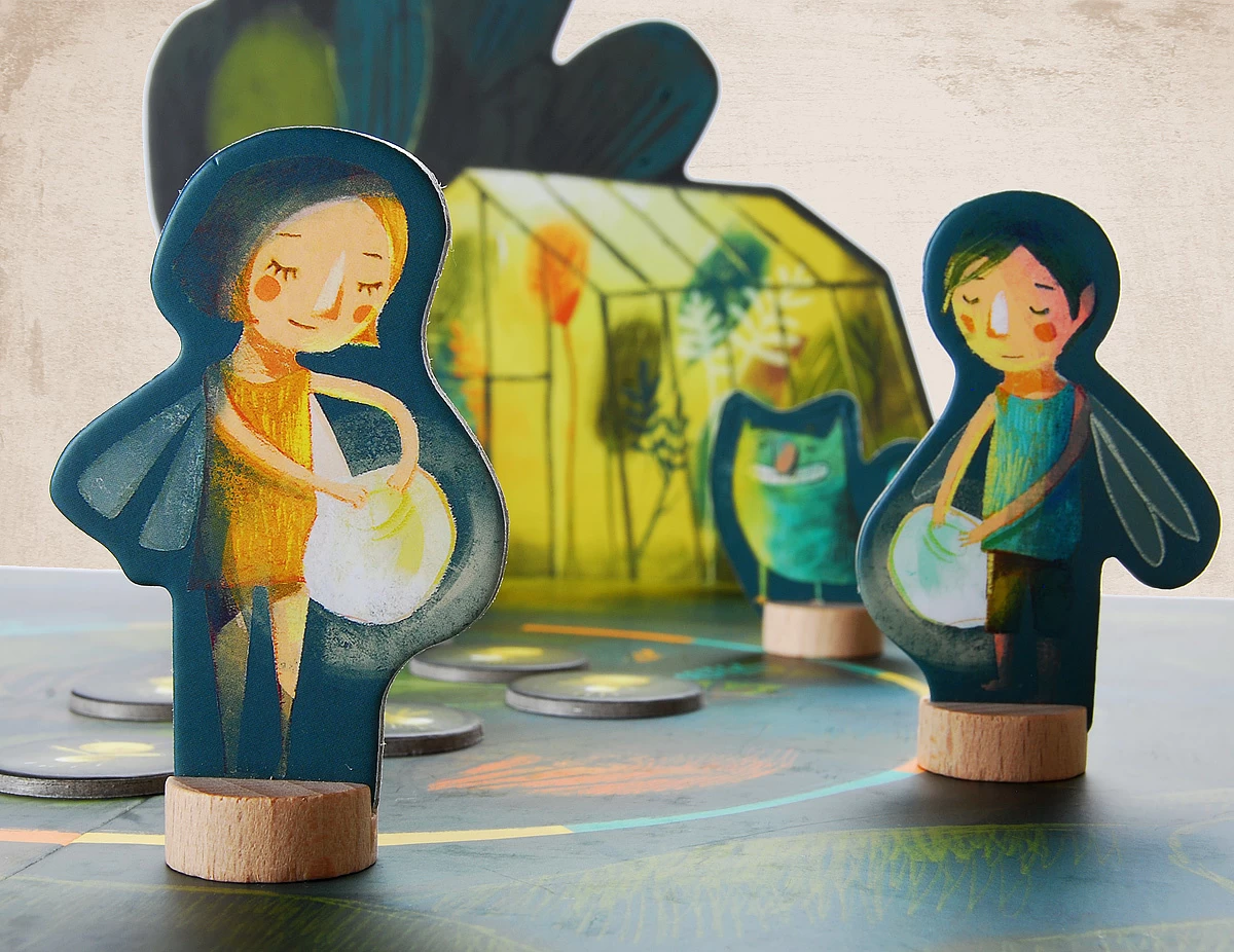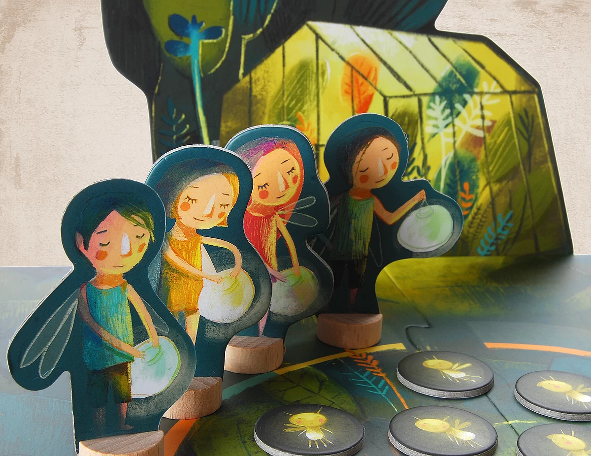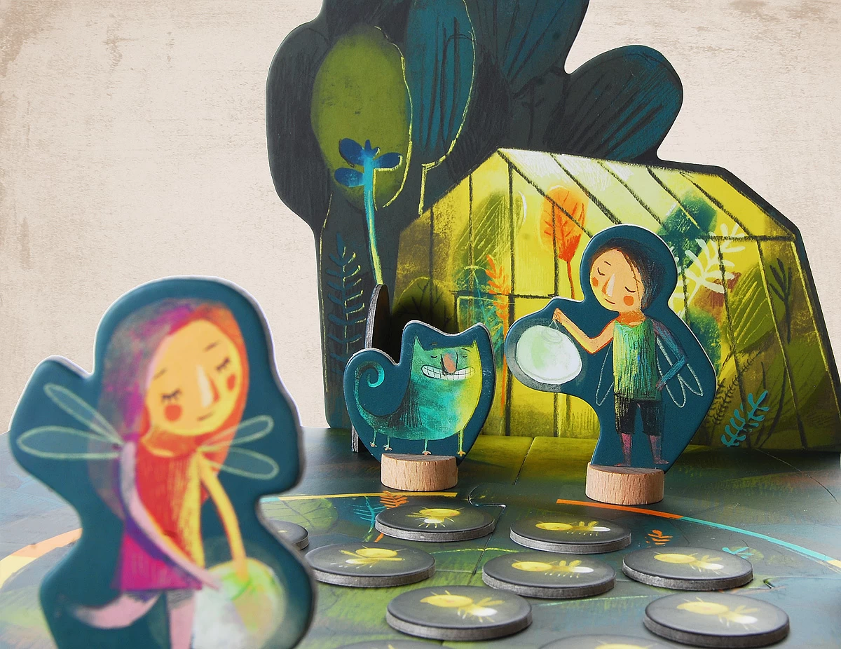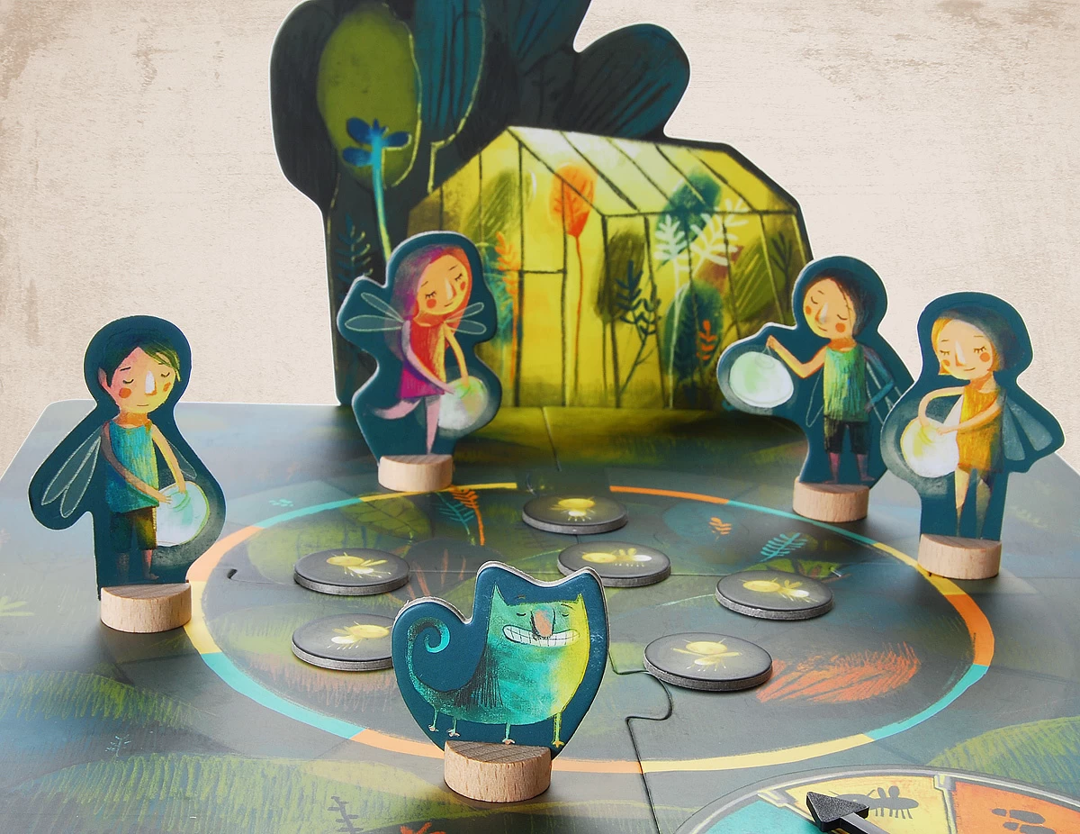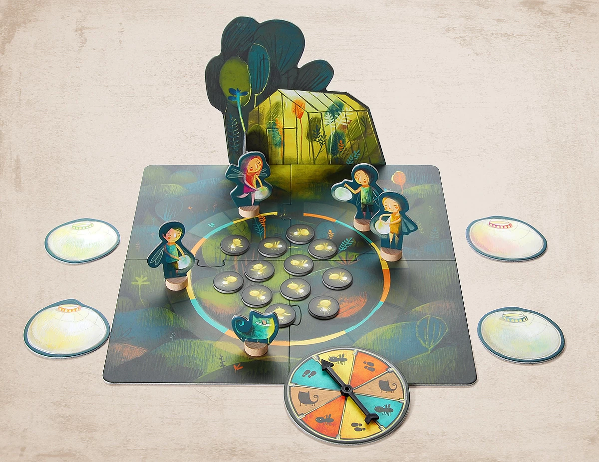 Inhoud: 1 speelbord, 1 draaischijf, 4 nacht feeën, 4 lantaarns, 1 Groene Giechel, 1 plantenkas, 12 vuurvliegjes.
