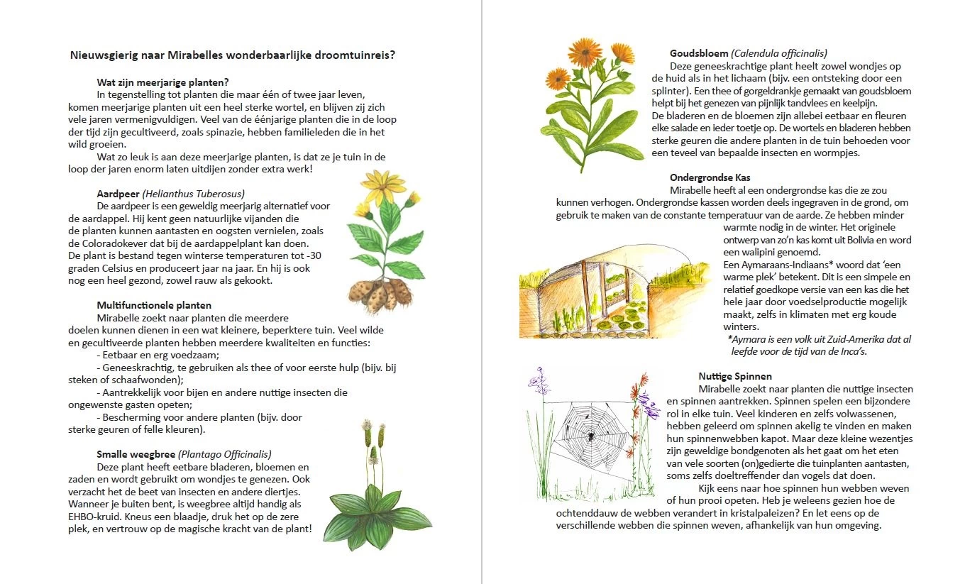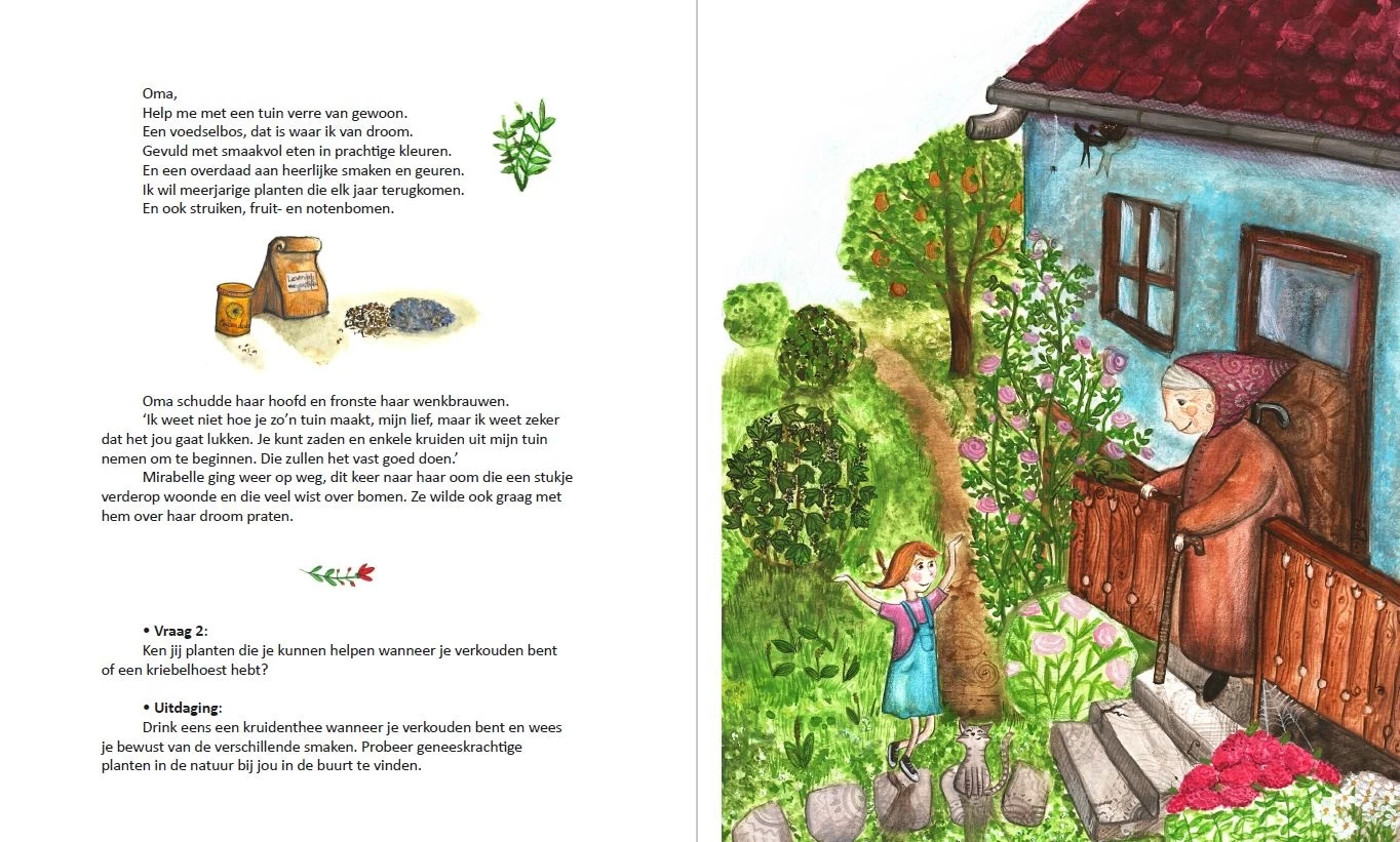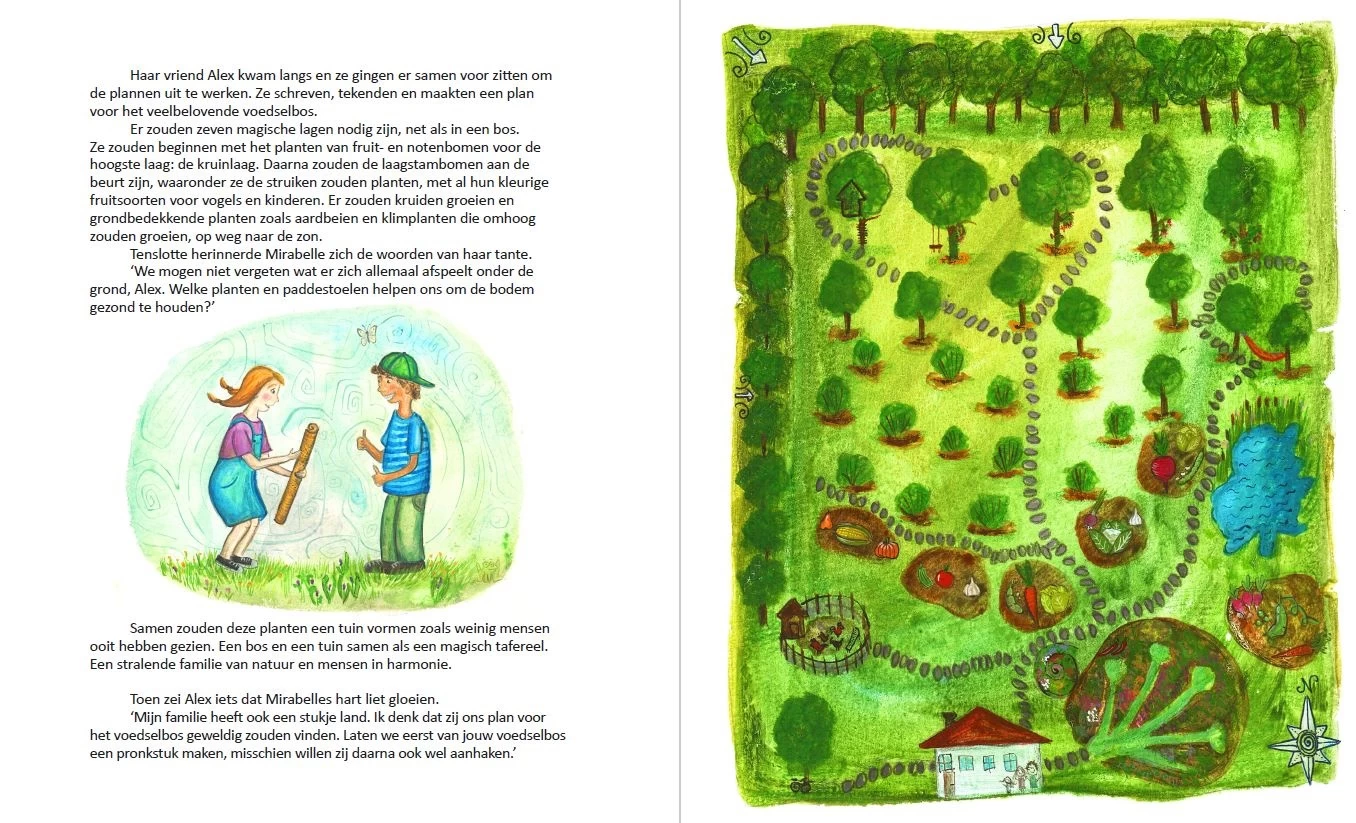 Mirabelle, een jong meisje, wandelt door haar dorp, terwijl ze zaden, advies en ondersteuning verzamelt voor het voedselbos waar ze van droomt. Een voedselbos voor haarzelf en haar omgeving. Het boek bevat prachtige illustraties, een mooi verhaal, een informatieve sectie met voedselbos-gerelateerd jargon en een gedeelte met creatieve, educatieve opdrachten. Het is zowel een fantasievol prentenboek als een educatief middel voor het leren over voedselbossen en permacultuur. een educatief kinderboek voor jong en oud dat gaat over een natuurlijke leefomgeving, durven, dromen en realiseren.