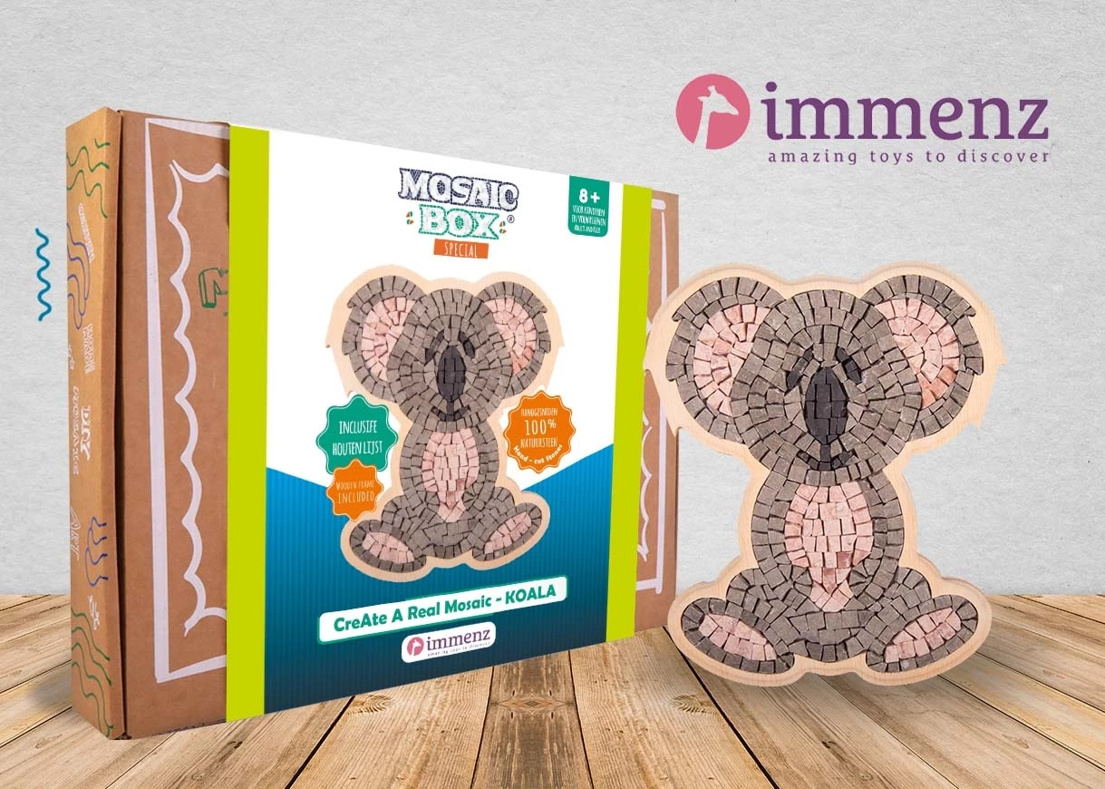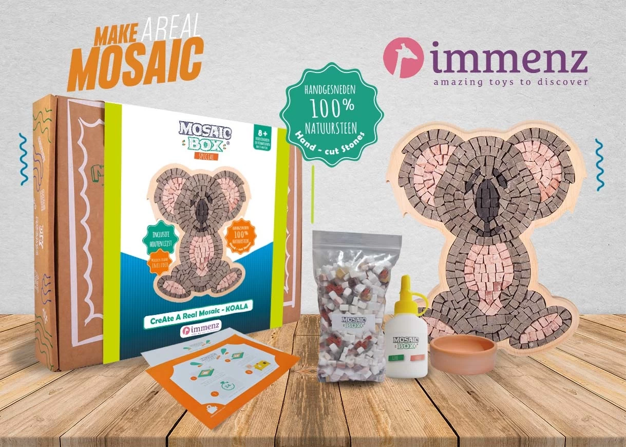 Het maken van een mozaïek met Mosaibox is anders dan met Mosaikit waarbij je meer een mozaïek maakt zoals het origineel gaat, namelijk door de mozaïek stukjes op een ondergrond in te gipsen. Mosaibox Koalabeer is een compleet DIY pakket waarbij je jouw mozaïek direct aan de muur ingelijst kunt ophangen. Je gaat aan de slag met alleen lijm en dus is het mozaïek maken een schonere bezigheid. Bij de SPECIAL heeft de lijst tevens de vorm van de gekozen afbeelding.
