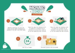Het maken van een mozaïek met MOSAIBOX is anders dan met MOSAIKIT waarbij je meer een mozaïek maakt zoals het origineel gaat, namelijk door de mozaïek stukjes op een ondergrond in te gipsen. MOSAICBOX is een compleet DIY pakket waarbij je jouw mozaïek direct aan de muur ingelijst kunt ophangen. Je gaat aan de slag met alleen lijm en dus is het mozaïek maken een schonere bezigheid.