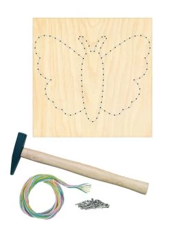 Maak met deze superleuke complete set je eigen spijkerkunstwerk voor aan de muur. Timmer de spijkers in het hout in de juiste vorm, wikkel touw naar wens tussen de spijkers en er komt een mooi draadfiguren beeld naar voren. Hang je knutselwerkje op aan de muur!