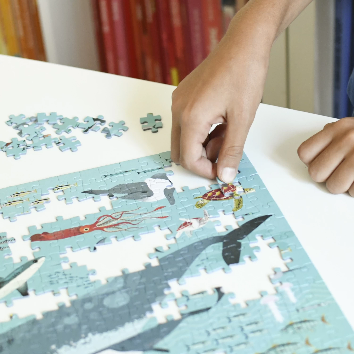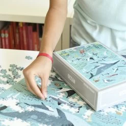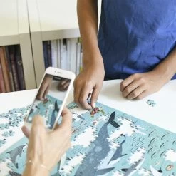 Geniet van de walvissen, haaien en manta roggen, vakkundig geïllustreerd door Lucie Brunellière, en laat je vrienden het eindresultaat zien! Puzzel van 500 stukjes met thema ‘zee’ voor kinderen en volwassenen. Generatieloos en tijdloos!