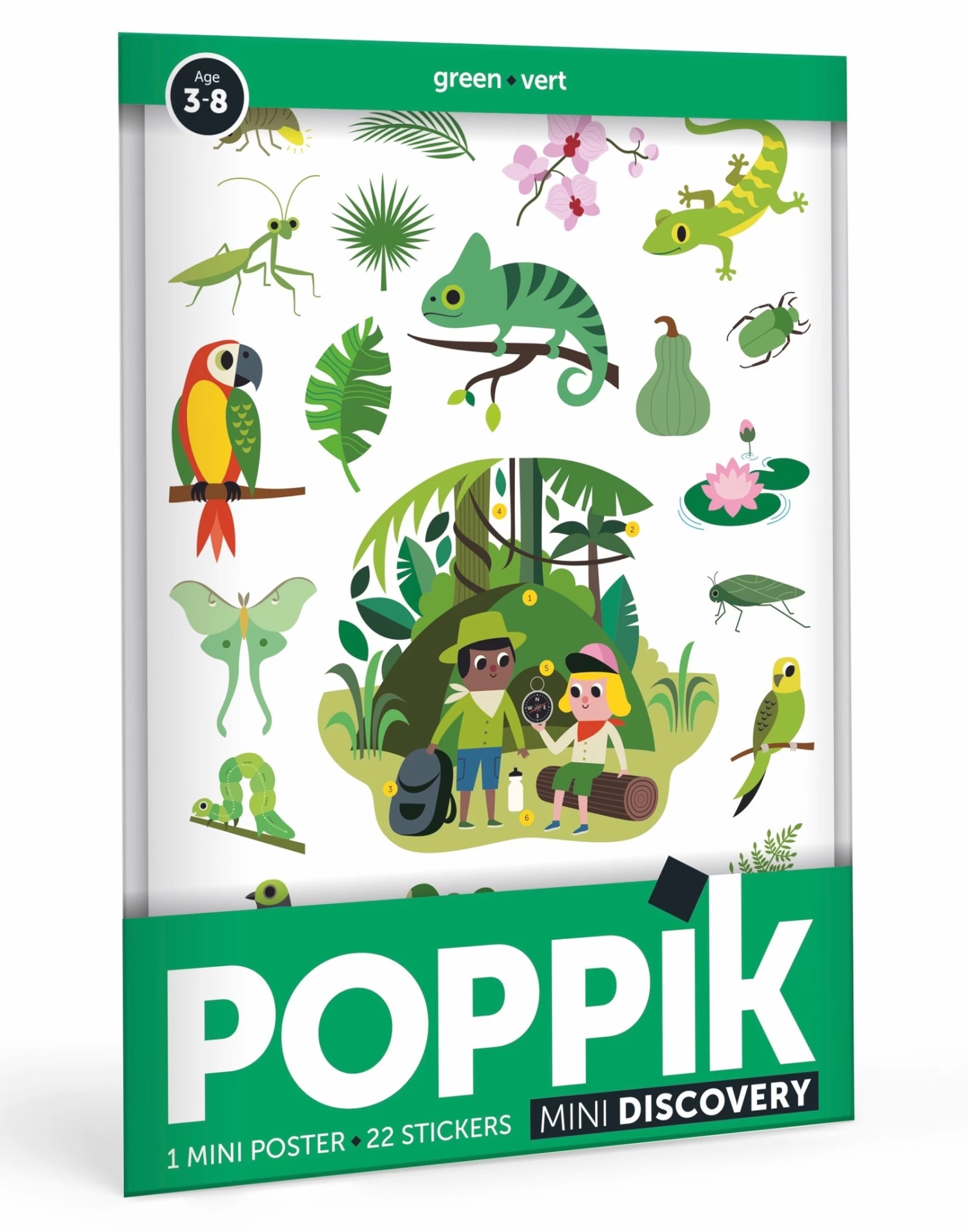 Ontdek deze mooie poster met 22 herpositioneerbare stickers met het thema van de jungle: papegaai, hagedis, kameleon, rups … Alle tinten groen zijn aanwezig op de poster. Deze mini jungle poster heeft een A4 formaat en is zeer eenvoudig in te lijsten. Verzamel de kleurrijke Poppik-posters om een decoratieve gekleurde muur te creëren!