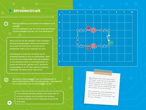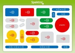 Alle stevige onderdelen van het pakket hebben een code, een symbool en een kleur. Zo wordt het overzichtelijk om verschillende circuits te leren maken. Je kunt ook zelf aan de slag gaan en je eigen schema’s bedenken. Spektro is beveiligd tegen overbelasting en kortsluiting, dus als je per ongeluk toch een foutje maakt is dat geen enkel probleem.