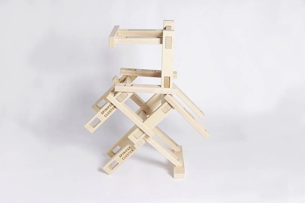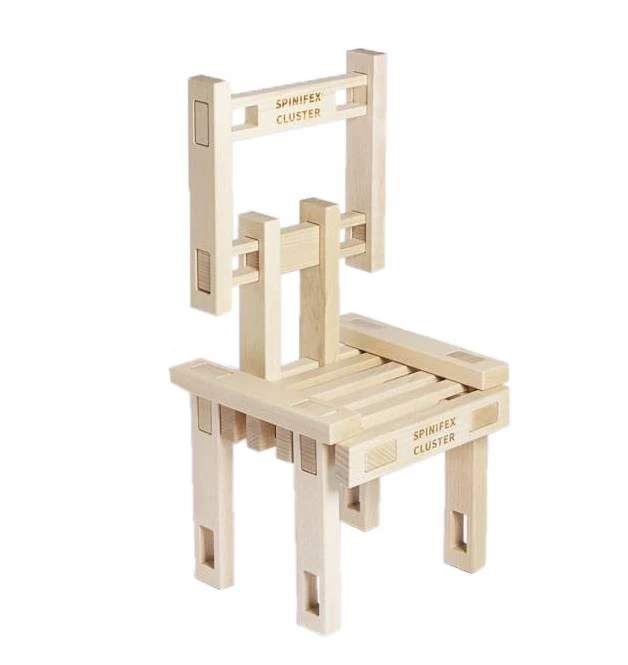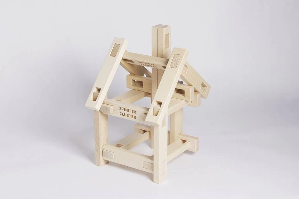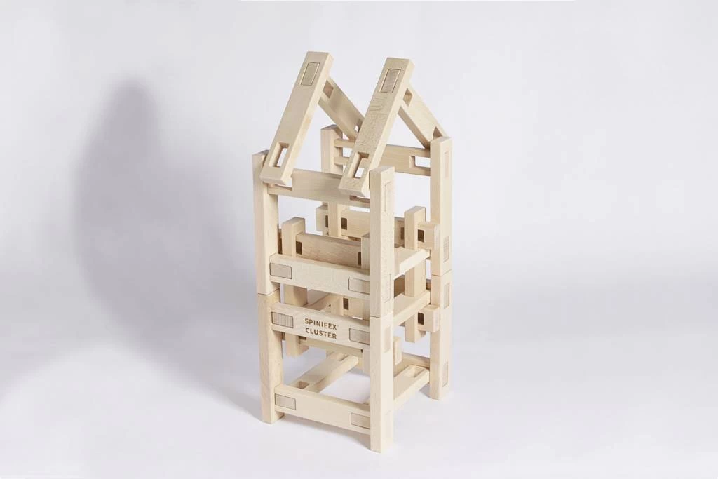 SPINIFEX CLUSTER is houten constructiespeelgoed bestaande uit 20 cm houten plankjes met uitsparingen die moeiteloos en intuïtief met elkaar kunnen worden verbonden door middel van een steekverbinding.