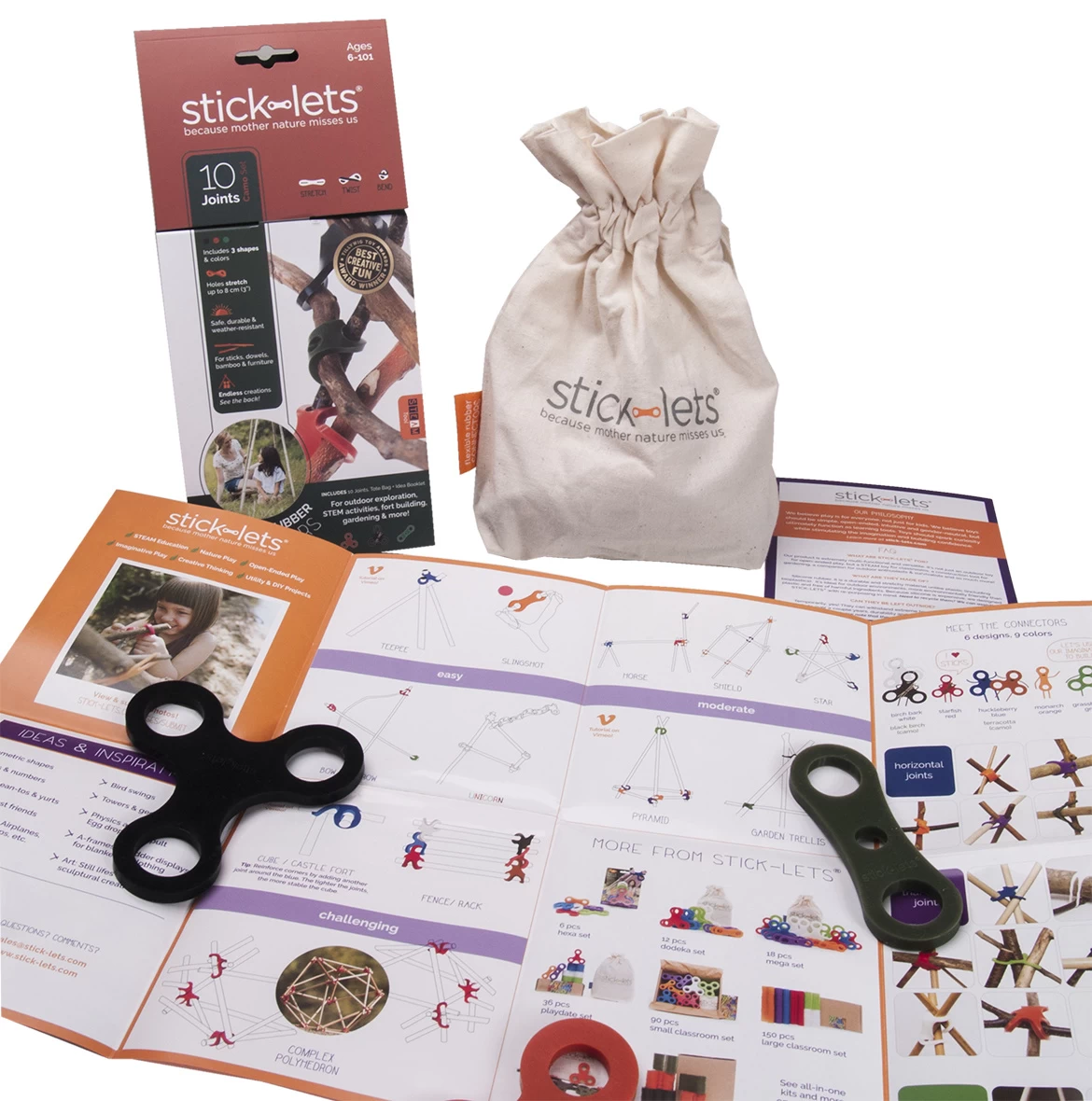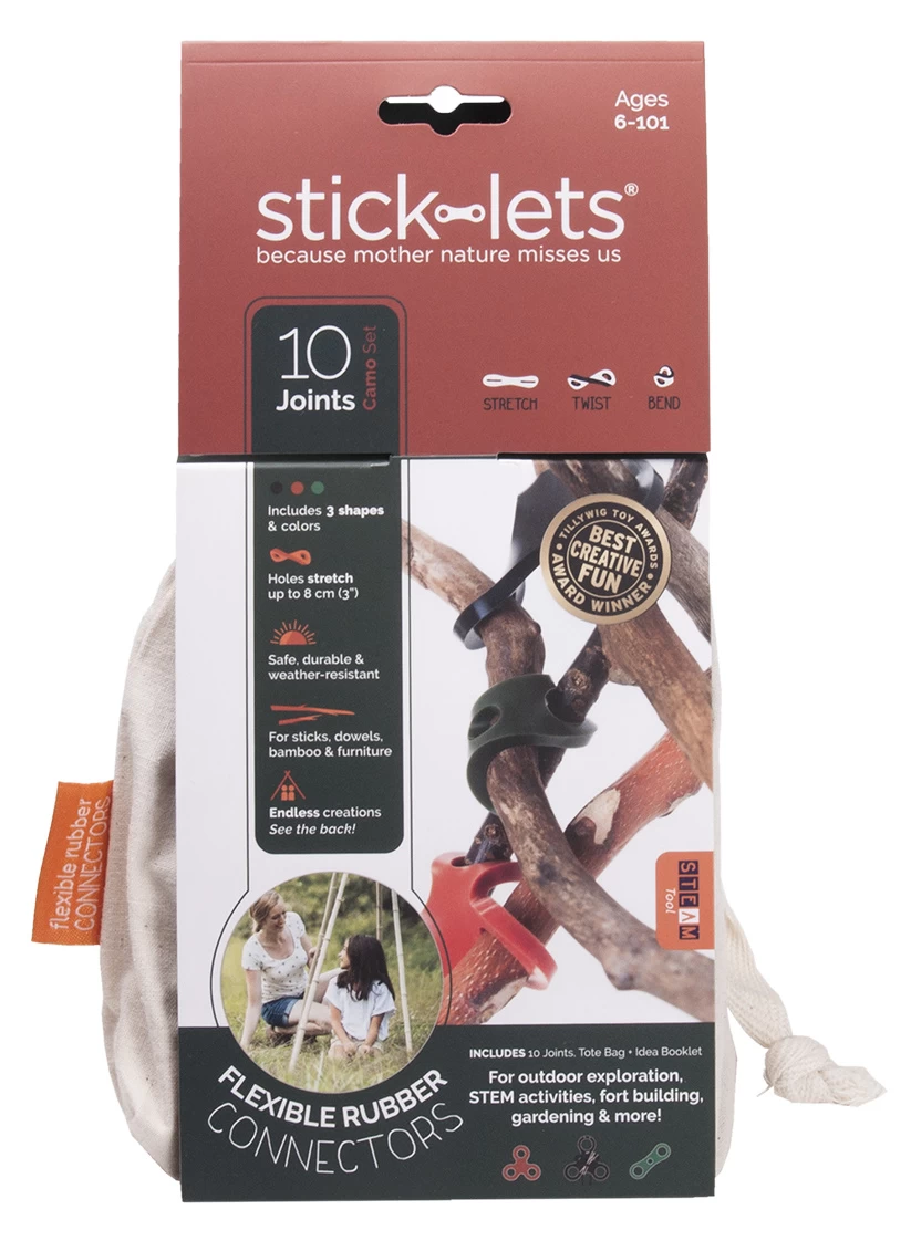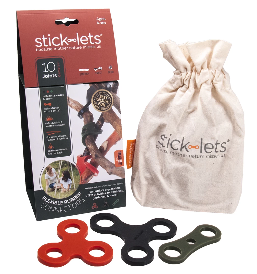 De Stick-lets 10-delige set Camouflage-kleuren is geïnspireerd op de schoonheid van het bos. Het zijn dezelfde ontwerpen als de standaard kleuren Stick-lets en hebben dezelfde rekbaarheid als onze Classic Fort Kits. Neem deze duurzame verbindingsstukken mee naar het bos voor een aantal avonturen in de wildernis, maar laat ze alsjeblieft niet achter!