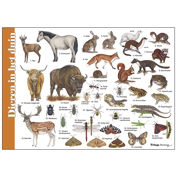 Op deze herkenningskaart / zoekkaart staan de dieren die je kunt tegenkomen in het duingebied. Denk aan een huppelend konijn, een statige ree, een parmantige vos, maar ook de schotse hooglander of de zandhagedis. Op de achterzijde van de kaart vind je per soort meer informatie.