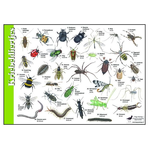 Kriebel mee met deze kaart over kriebeldiertjes! Van worm tot sprinkhaan en diverse kevertjes, al deze kriebeldiertjes kennen we. Maar hoe zien ze er nou echt van dichtbij uit en wat zijn hun eigenschappen? Op deze kaart zie je precies hoe ze leven en waarom ze daar leven. Ga op onderzoek uit en kijk of jij ze allemaal in je tuin of in de bossen vindt!