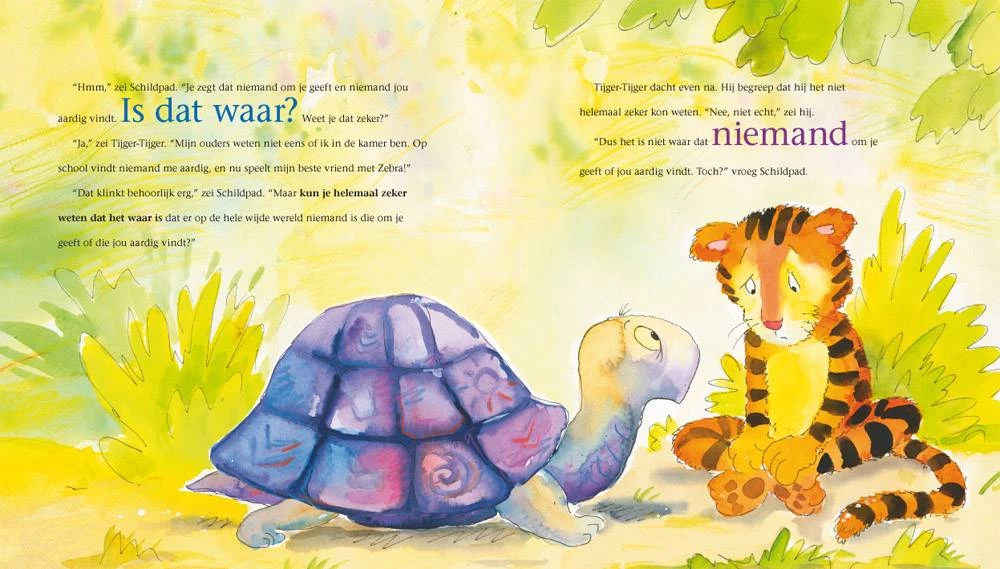 Tijger-Tijger heeft een rotdag. Zijn ouders maken ruzie, zijn beste vriend speelt met iemand anders en de sportdag is ook al niet leuk. Dan ontmoet hij Schildpad die hem vraagt waarom hij zo verdrietig is. Schildpad stelt hem vier vragen die alles veranderen.
