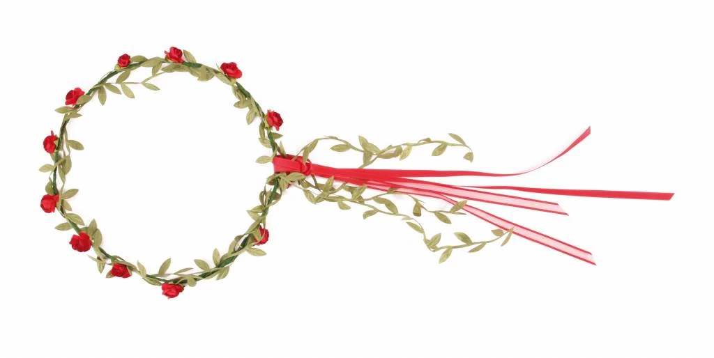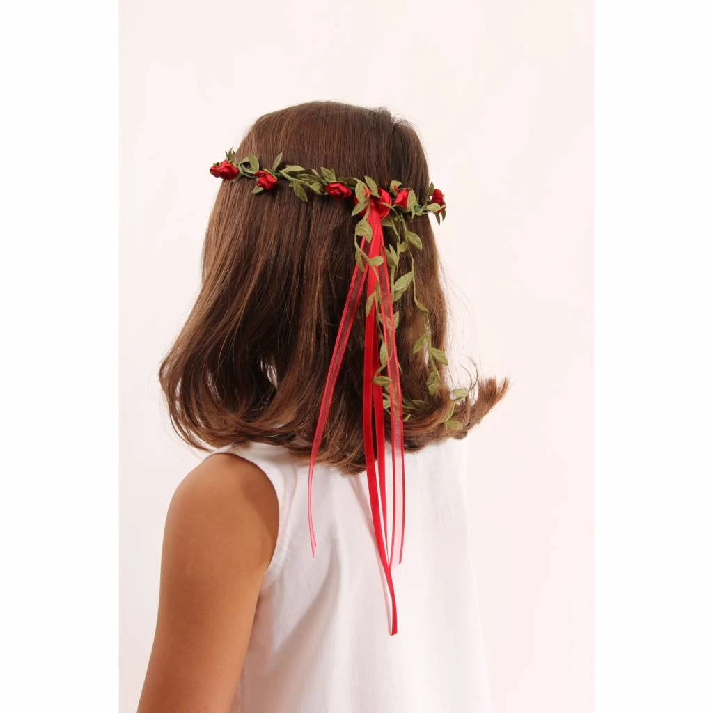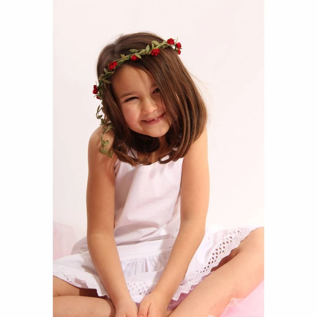 Mooie bloemenkrans met rode roosjes voor kinderen. Doorsnede is 17,5 centimeter. Knip hem door indien de krans iets te groot is, maak hem op maat en zet weer vast. Een bloemenkrans maakt meestal meisjes erg blij, maar is ook ideaal om te gebruiken voor verkleedfeesten, bruiloften, carnavalsoptochten en voor kinderpartijtjes.