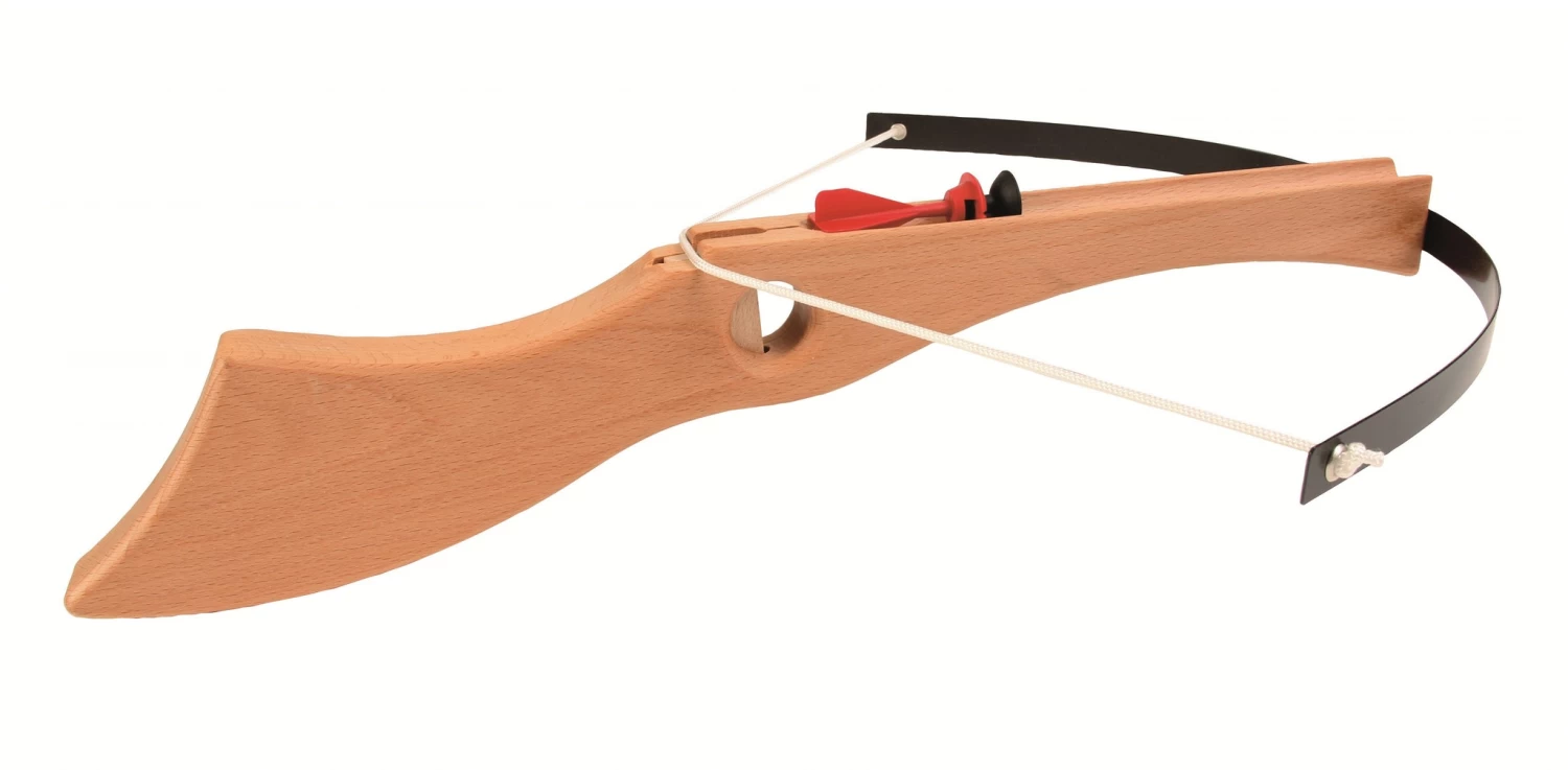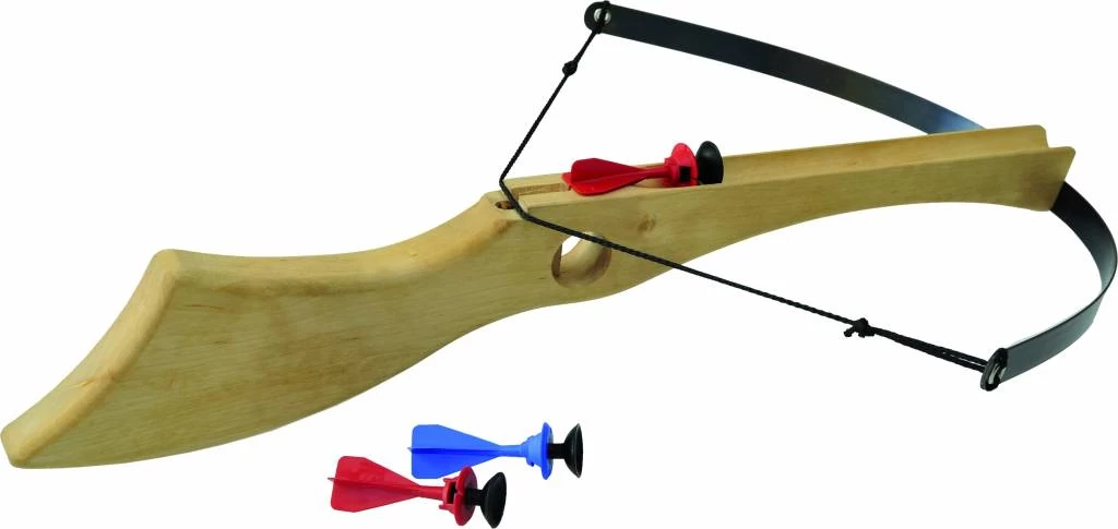 Deze kruisboog van hout uit 1 stuk en inclusief 3 pijlen met zuignap is 45 centimeter lang. De veer is van verenstaal en zeer goede kwaliteit. Het is mogelijk om een extra set pijlen bij te bestellen en ook het ’target’ is los verkrijgbaar. De boog is meer een hankruisboog dan een schouderkruisboog. Bij jongere kinderen lukt dat nog wel.